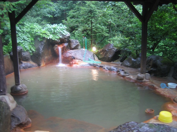 14:30 『恵比須之湯(荒城温泉)』。泉温25度なので加温ありの源泉かけ流し。泉質は遊離炭酸温泉で、有馬温泉のような橙色または赤茶色をしている。