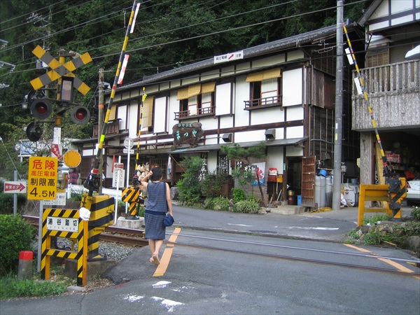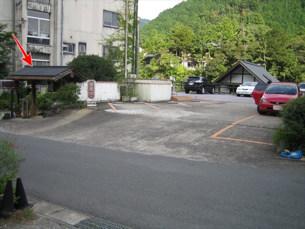 15:30 『食事処ゆかわ(湯谷温泉)』。赤矢印の屋敷門から入って階段を下ると建物がある。