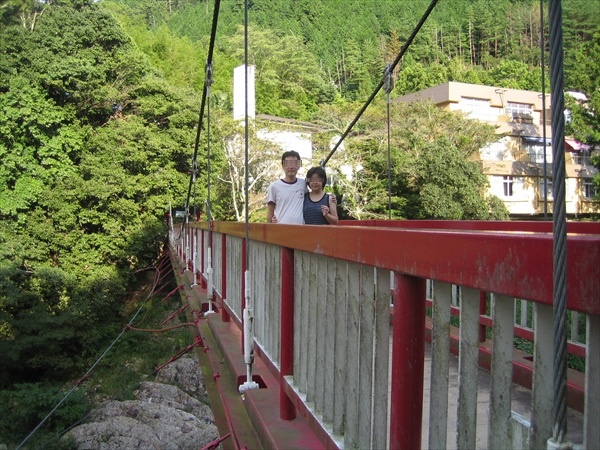 浮石橋。温泉街にかかる赤い橋は風情がある。