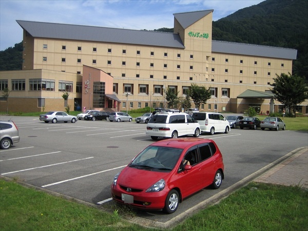 15:30 『天領(白山一里野温泉)』。車の天井あたりに映っている三角屋根の建物がその入口。無色透明な泉質はナトリウムー塩化物温泉(低張性弱アルカリ性高温泉)。