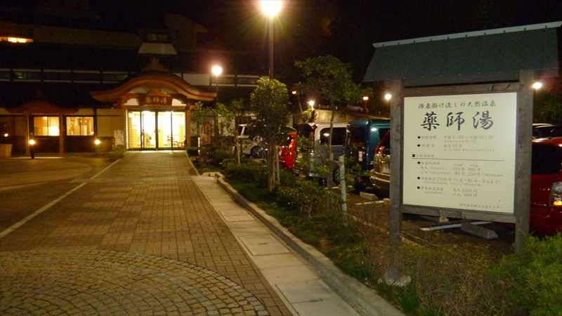 2008年に旧町役場の跡地に移転新設された『薬師湯(湯村温泉)』。橋を渡ったところにあった旧薬師湯には2003年に入湯済みだが、こちらはまだ入ったことがなかったので今回が初入湯。2時間まで無料の駐車場も完備され便利になった。泉質はナトリウム-炭酸水素塩・塩化物・硫酸塩泉[低張性-中性-高温泉]で、泉温78℃という熱めのお湯が加水なし、加温なし、循環ろ過なし、塩素殺菌なしで源泉かけ流しされている。入浴料400円×2人。