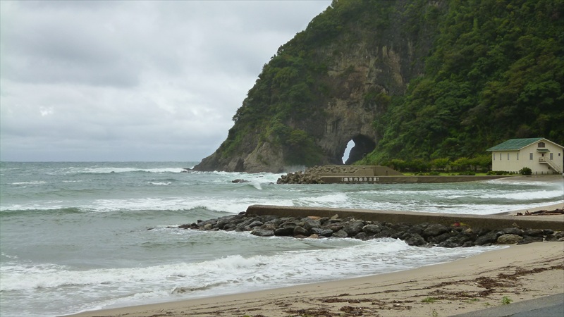 日本海の荒波に侵食されてできた幅24m、奥行き約40m、高さ13.8mの洞門。