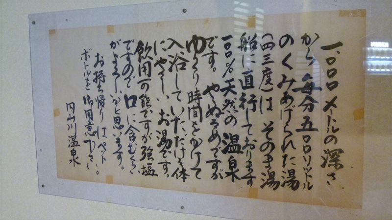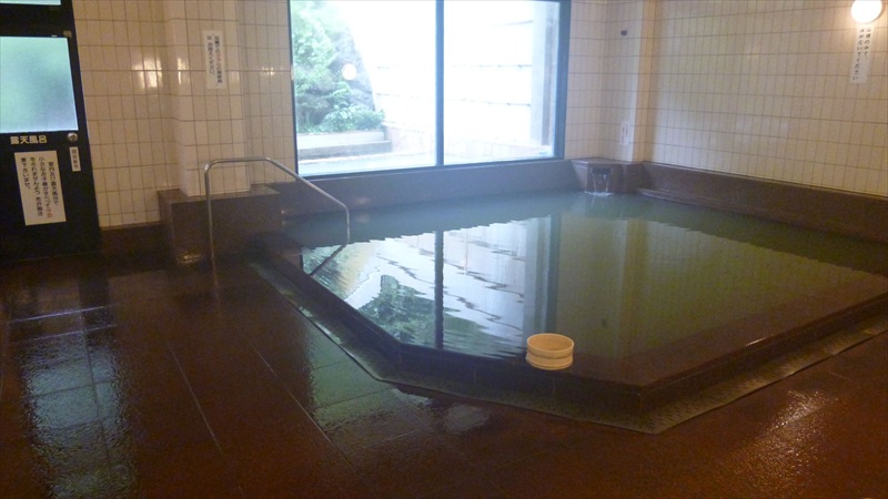 泉質はカルシウム・ナトリウム-塩化物強塩泉[高張性-弱アルカリ性-温泉]。湯舟に満たされた薄緑色の少しぬるめのお湯は完全な源泉かけ流し。そうめったにお目にかかれないほどの気持ちの良い温泉である。