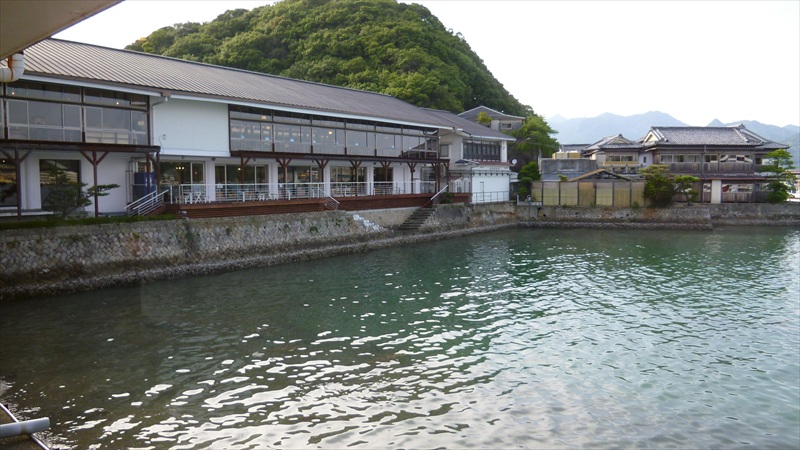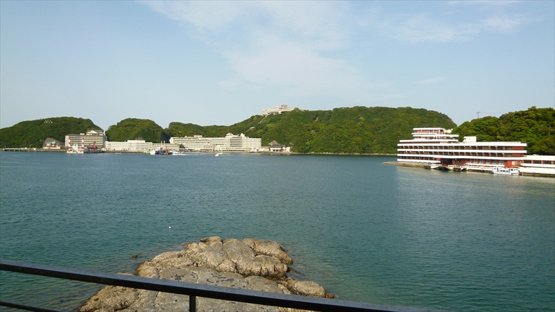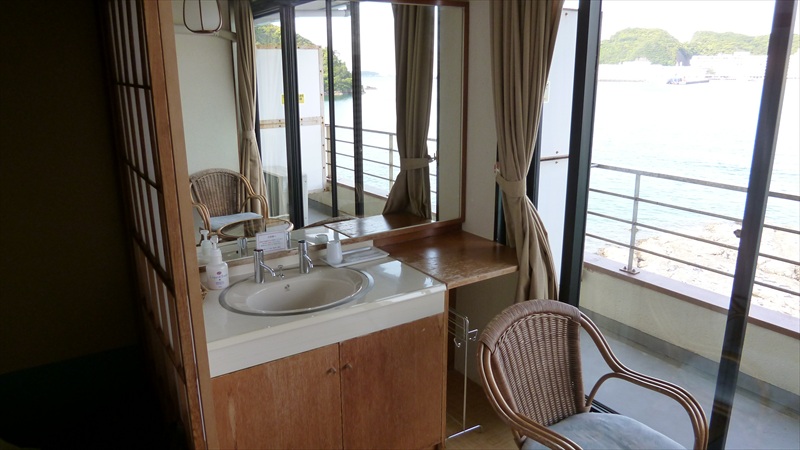 広縁からの眺望は最高である。すぐ近くにホテル中の島、少し遠くにホテル浦島が見える。