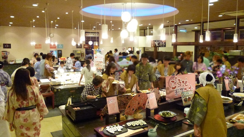 20:00 「四季彩」で夕食バイキング。マグロはもちろんのこと、【めはり寿司】【ヒロメのしゃぶしゃぶ】などのご当地グルメもたくさん。