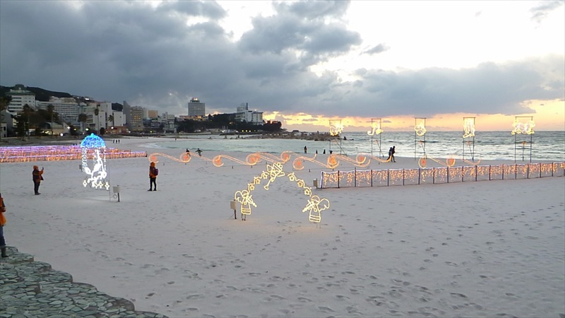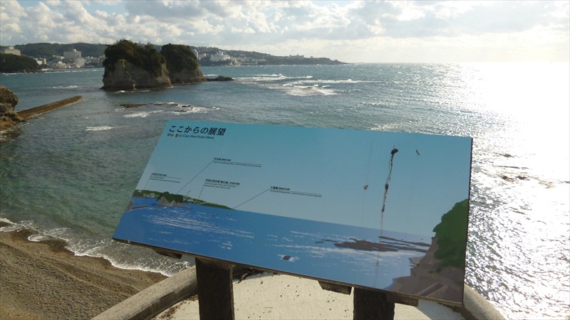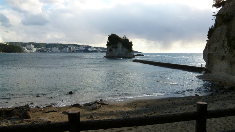 ここからは円月島を斜め後ろから見れる。その先には白良浜のホテル群。