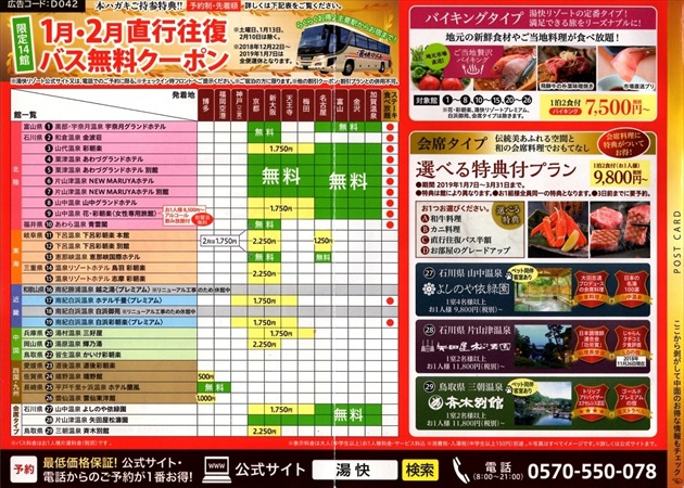 今回郵送されてきた湯快リゾートからのお得なハガキ。わりと頻繁に送られてくる。このバス無料クーポンを見ると全施設が対象となるわけではなく新大阪発着だと9つの施設。その中で最も遠方にあるのは『宇奈月グランドホテル』である。もちろん遠方であればあるほどお得であるというセコイ考えに基づいている。本来なら2人で11880円のバス料金が無料になるのだ。またバス利用だと自家用車で行く場合と違って積雪の心配をしなくても良いという利点もある。