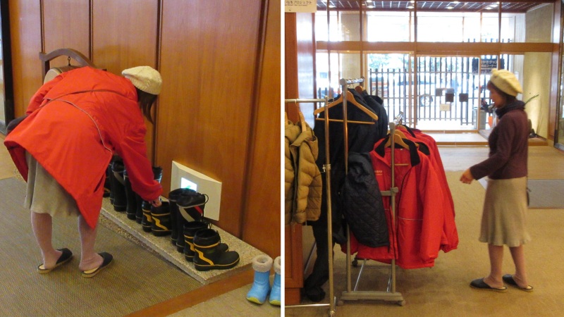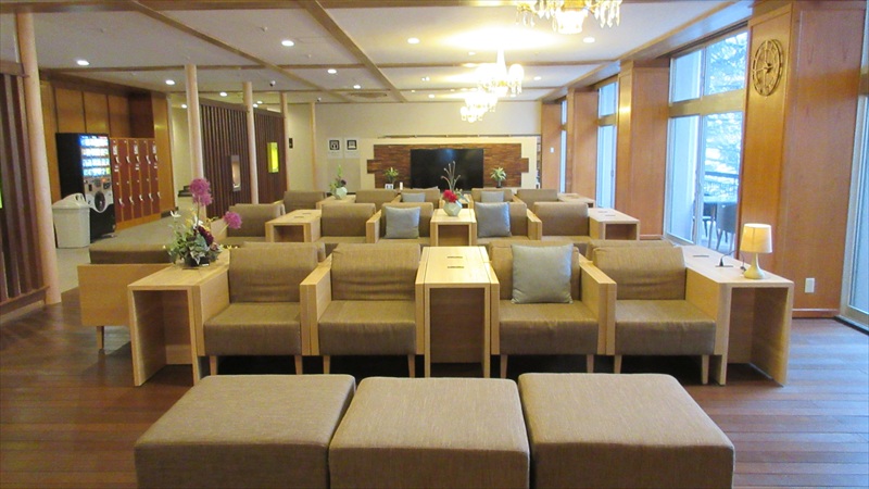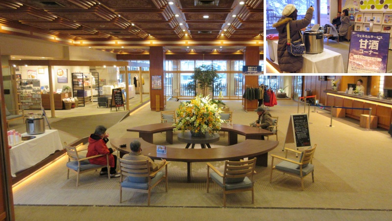 きれいで広々としたフロント。「ウェルカムサービス甘酒コーナー」はうれしい。