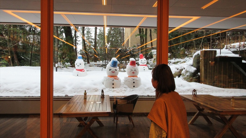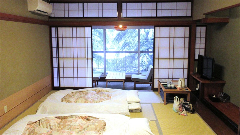 まぁまぁ広い和室。古さはあるもののきれいに掃除はされており、セーフティボックスや冷蔵庫など必要なものは一通り完備されている。窓の外は雪景色。トイレはもちろん温水洗浄便座。