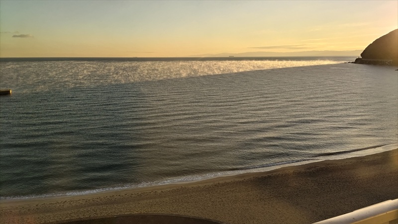 おそらく気嵐と呼ばれる現象で朝陽にあたる場所から水蒸気が海面に立ち込める。
