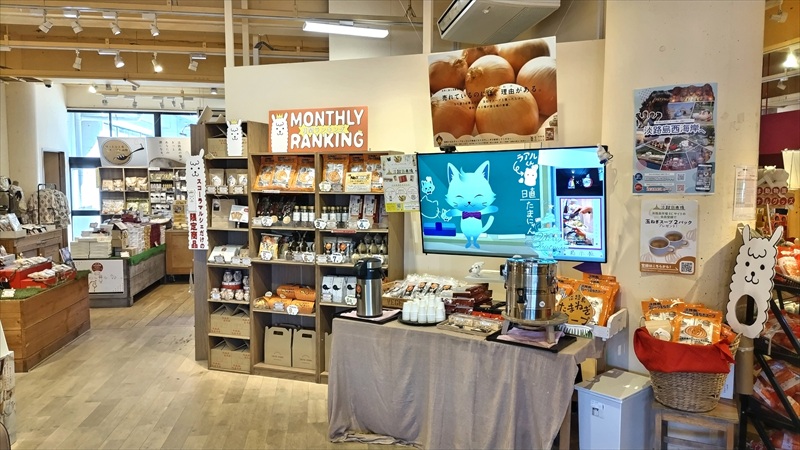 淡路島の特産品が多数陳列されている。【フルーツ玉ねぎスープ】コーナーではTV画面の猫が話しかけてくれて楽しい。